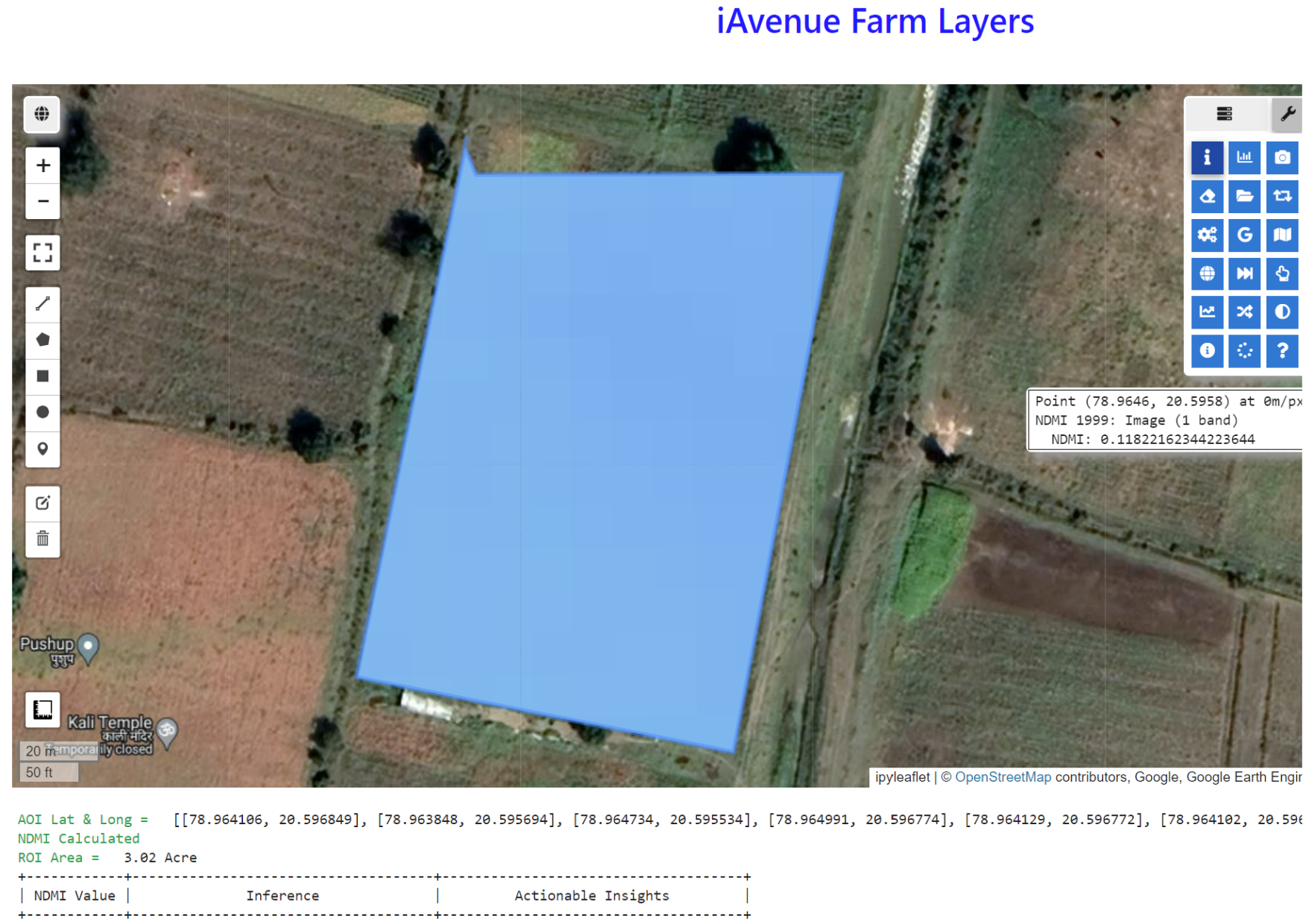 Severe drought conditions can ruin the total agricultural production in addition to stressing the crops. NDMI is able to identify water stress at an early stage, before the issue becomes unmanageable. Additionally, employing NDMI to monitor irrigation, particularly in regions where crops need more water than the nature can provide, dramatically enhances crop development. As a result of this, NDMI becomes a reliable indicator of water stress in agricultural fields.